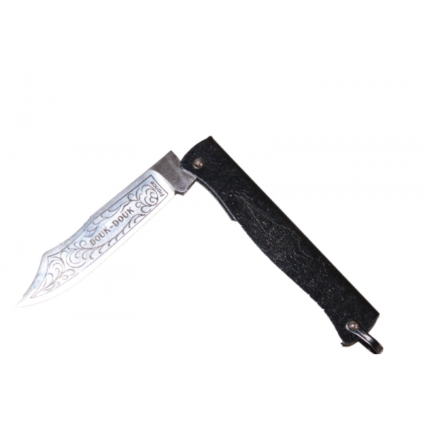 - Lame acier au carbone, manche en acier replié, emblême « douk-douk » frappé en milieu de manche.